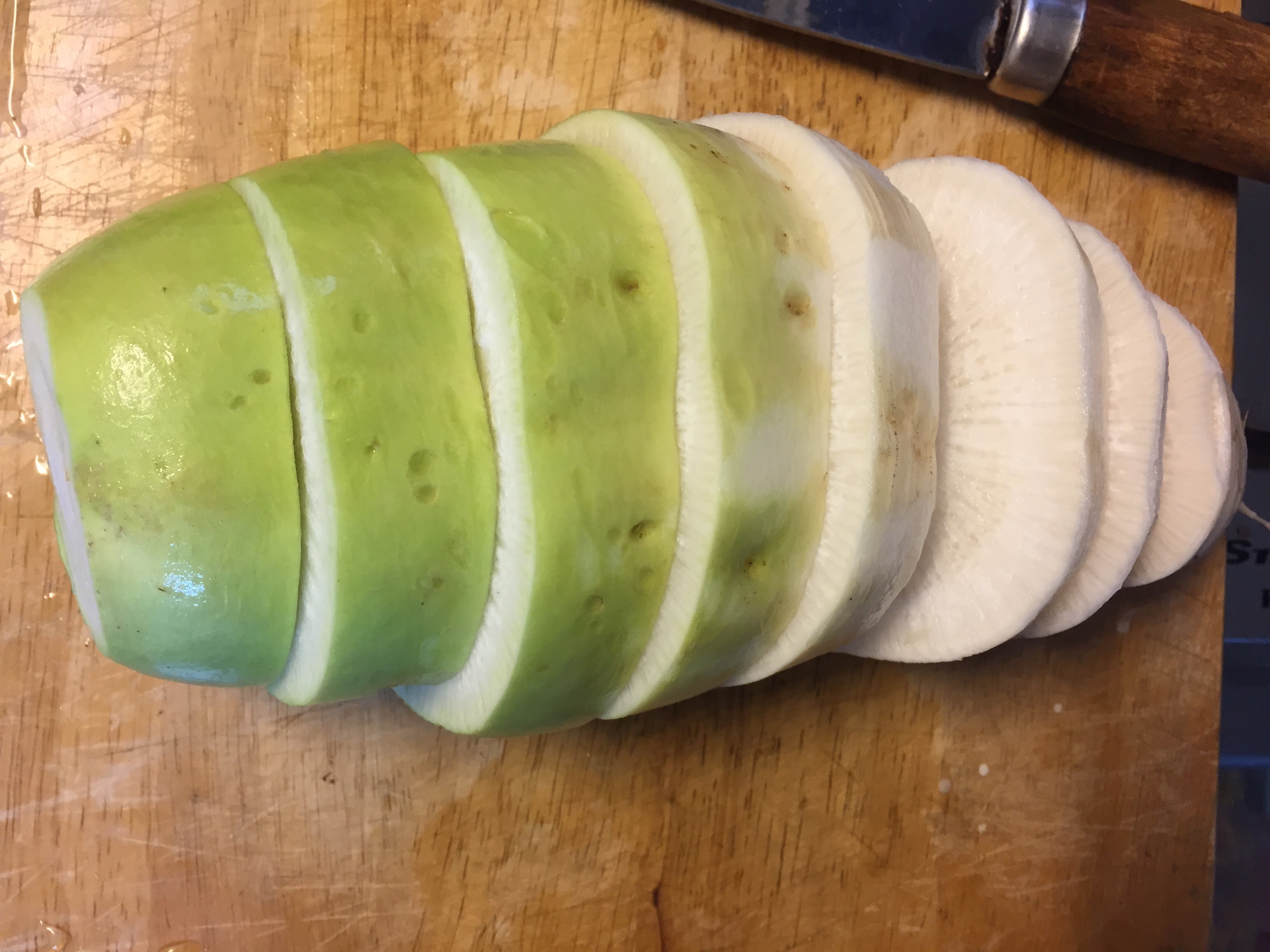 손질한 무를 풍덩풍덩 넣는다